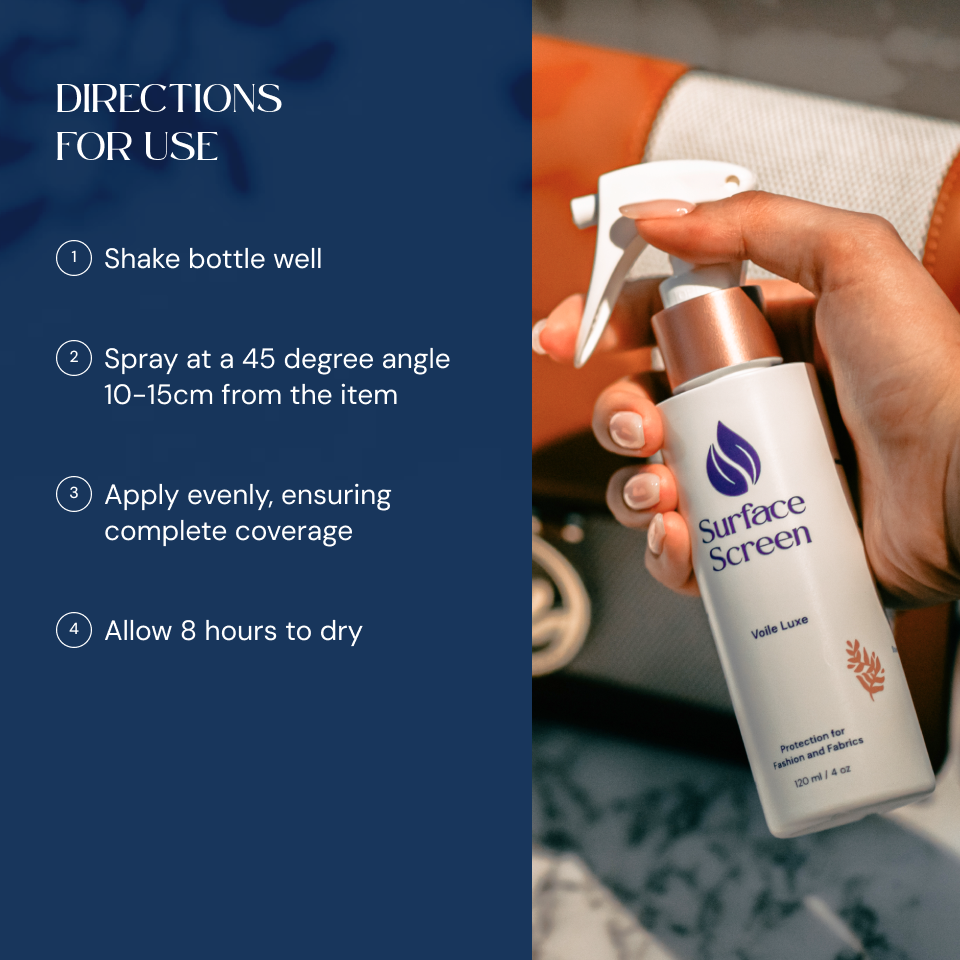 Enhances the longevity of designer shoes, handbags, and apparel, ensuring they remain pristine with minimal upkeep. Free from PFAS, alcohol, and harsh chemicals, this non-toxic, biodegradable formula is safe for delicate materials such as silk, suede, wool, and fine cotton, making it the perfect choice for high-end fashion protection.